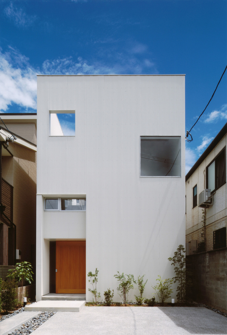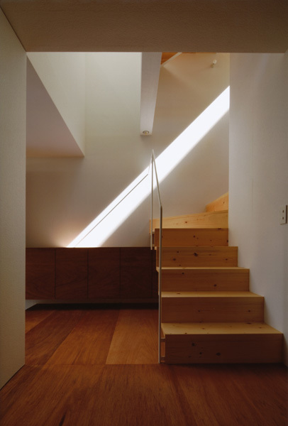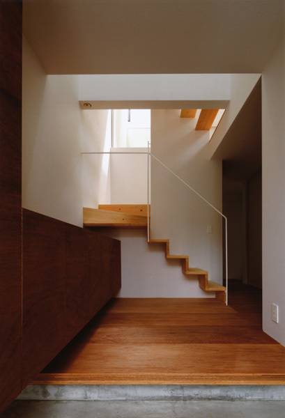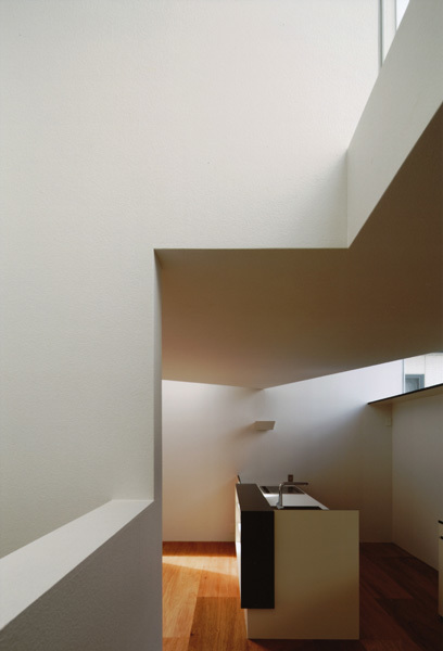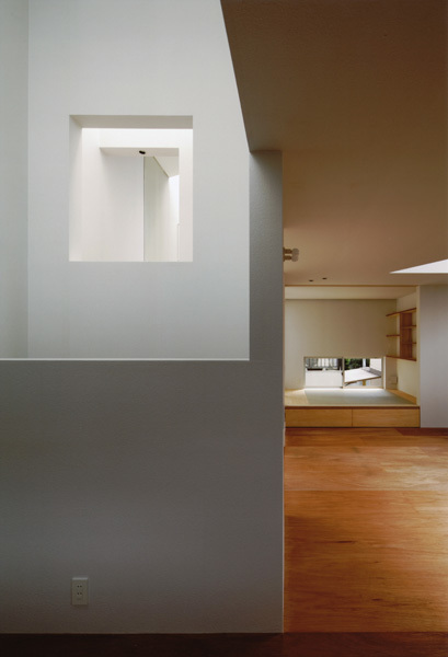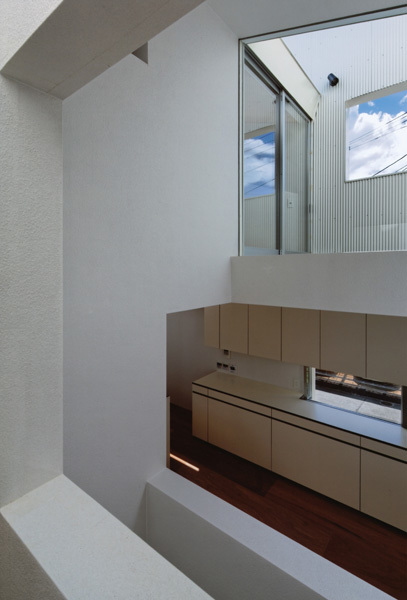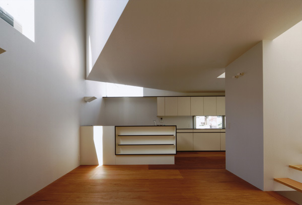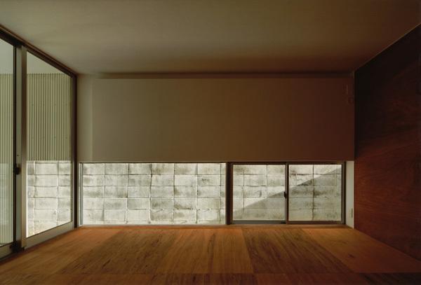 都市部の過密な住宅地に建つ住宅。開口部とそこに面するインテリアの作り方によってプライバシーを確保しながら間接光に彩られる空間を目指した。