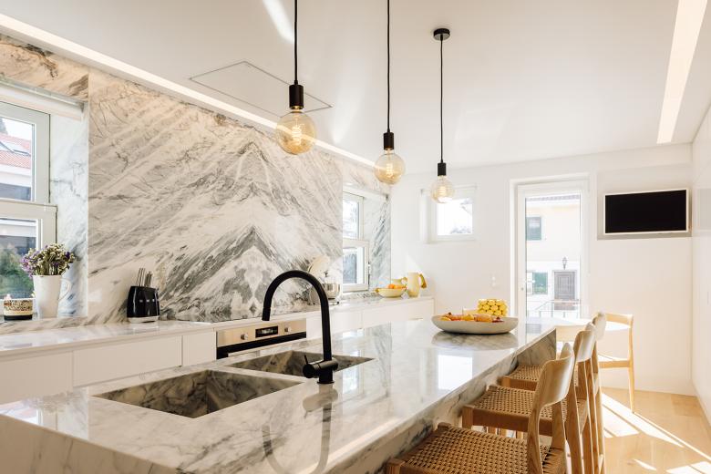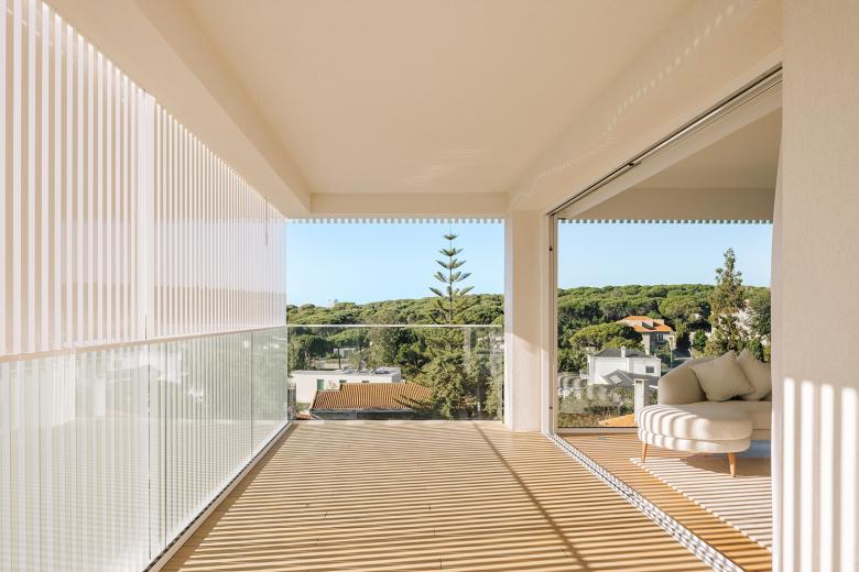 Ein neuer Anbau, der mit beweglichen Lamellen aus weiß lackiertem Aluminium verkleidet ist, ergänzt das ursprüngliche Gebäude und bringt Leichtigkeit in das Ensemble. Das Spiel aus offenen und geschlossenen Fassadenelementen erzeugt ein lebendiges Wechselspiel von Licht, Sicht und Privatsphäre. Die Materialwahl, darunter Naturstein, Holz und handgefertigte Fliesen, verleiht dem Haus Wärme und Zeitlosigkeit. Im Inneren wurde das Haus vollständig neu organisiert. Der Sockelbereich dient heute nicht nur praktischen Zwecken, sondern bietet auch Platz für ein Gästezimmer, ein kleines Schwimmbad und einen privaten Kinoraum. Darüber liegen großzügige Wohn- und Essbereiche, in denen sich die Räume fließend ineinander öffnen. Eine maßgefertigte Möblierung begleitet durch das gesamte Haus und bietet Stauraum an den Stellen, an denen er benötigt wird. In der oberen Etage befinden sich zwei Gästezimmer und eine großzügige Master-Suite mit Blick über den Tejo. Ein neu ausgebautes Dachgeschoss bietet zusätzliche Rückzugsorte sowie eine Dachterrasse mit weitem Panorama. Die Verbindung von Bestand und Erweiterung zeigt sich nicht nur in der Architektur, sondern auch in der Haltung: Respekt vor dem Vorhandenen und Offenheit für das Neue. Im gesamten Gebäude kommen Schalter und Steckdosen der Serie LS 990 von JUNG in der Farbe Alpinweiß zum Einsatz. Ihre klare Formensprache und hochwertige Ausführung fügen sich nahtlos in das reduzierte Interieur ein und ergänzen es sowohl funktional als auch ästhetisch.