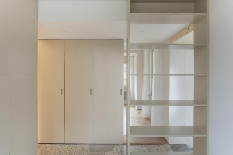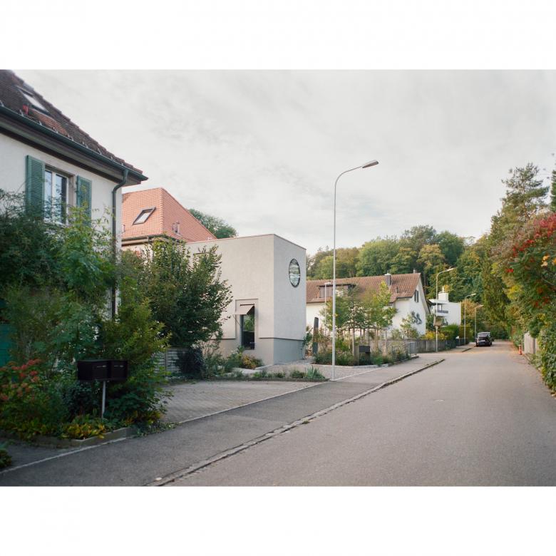 Der tektonische Ausdruck der neuen Fassade nimmt Bezug auf die bestehenden Details und Ornamente. Der Anbau soll als muraler Baukörper in Erscheinung treten, dabei wird das Sockelthema aufgenommen und zu einem gestalterischen Element. Die Bewegung des Sockels umfasst die Erweiterung und bildet zugleich eine Terrassenfläche im Aussenbereich. Die darüberliegenden Fassadenflächen sind mit einem grobkörnigen Putz versehen. Die neuen Fensteröffnungen übernehmen die Proportionen des Bestandes und der Halbkreis am Hauptgebäude manifestiert sich in Form eines runden Fensters Richtung Pestalozzistrasse. Im Bestand wurden die inneren Oberflächen und die gesamte Gebäudetechnik erneuert und auf den heutigen Stand gebracht.