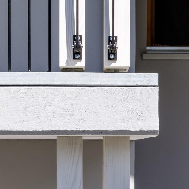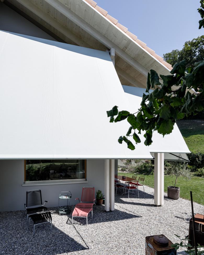 Die gesamte Fassadenhülle wird mit einer neuen Aussenwärmedämmung, Fenstern mit 3-fach Verglasung isoliert und entspricht dem aktuellen Energiegesetz. Ein feinkörniger, abgefilzter Modellierputz, harmoniert mit den neu eingesetzten, geölten Holzfenstern. Farbige Markisen in Aubergine und leichtem Grün akzentuieren das Wohnhaus, was durch weitauskragende Fallarmmarkisen unterstützt wird. Eine idyllische Verzahnung mit spannendem Lichteinfall zwischen Innen und Aussenraum entsteht. Die Dachuntersicht mit Dreischichtplatten, Sparren und Stützen wurden Weiss geölt und transportieren Licht in den Innenraum. Die Küche, Garderobenmöbel, sowie Decken und Böden wurden in Weiss geölter Fichte erstellt und harmonieren zum neuen zentralen Sichtbetonelement im Wohnbereich, sowie zu den schwarz eingefärbten Anhydritböden.