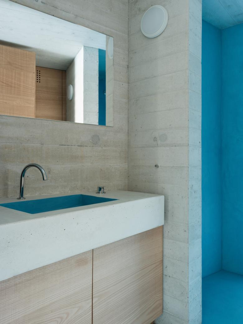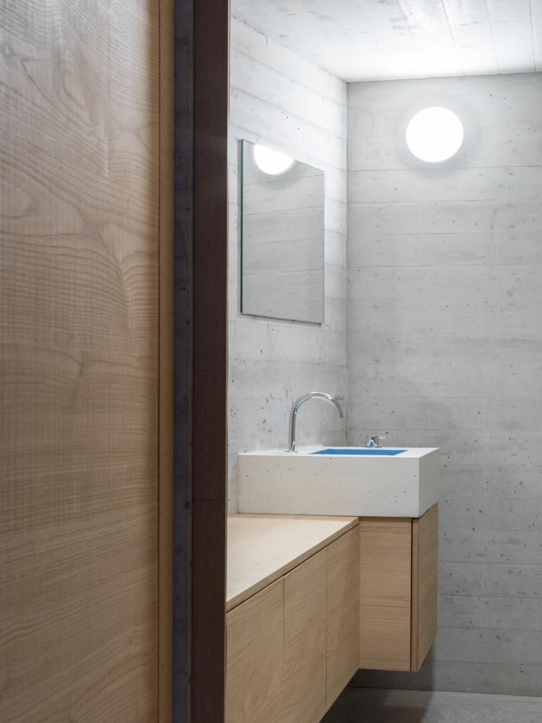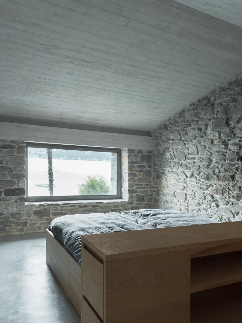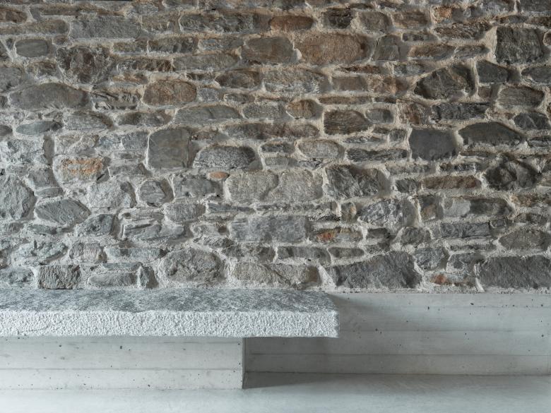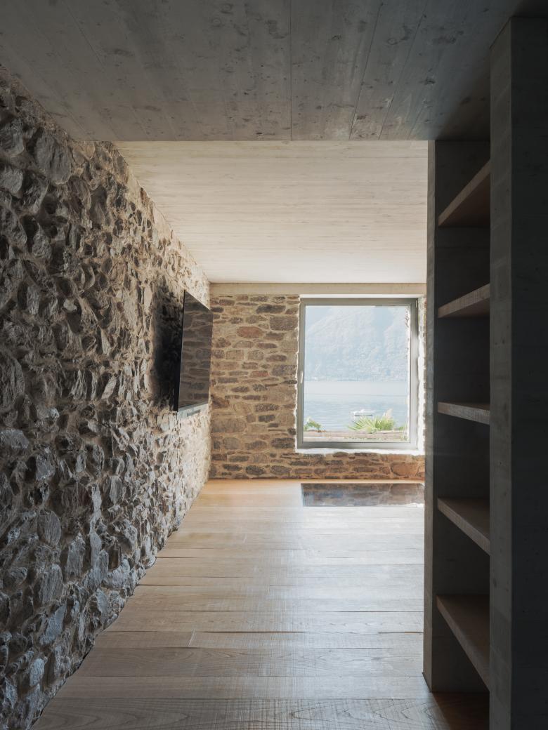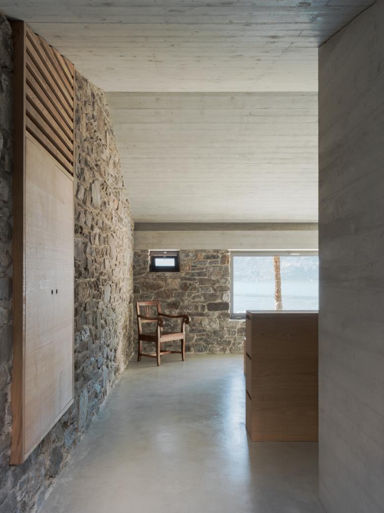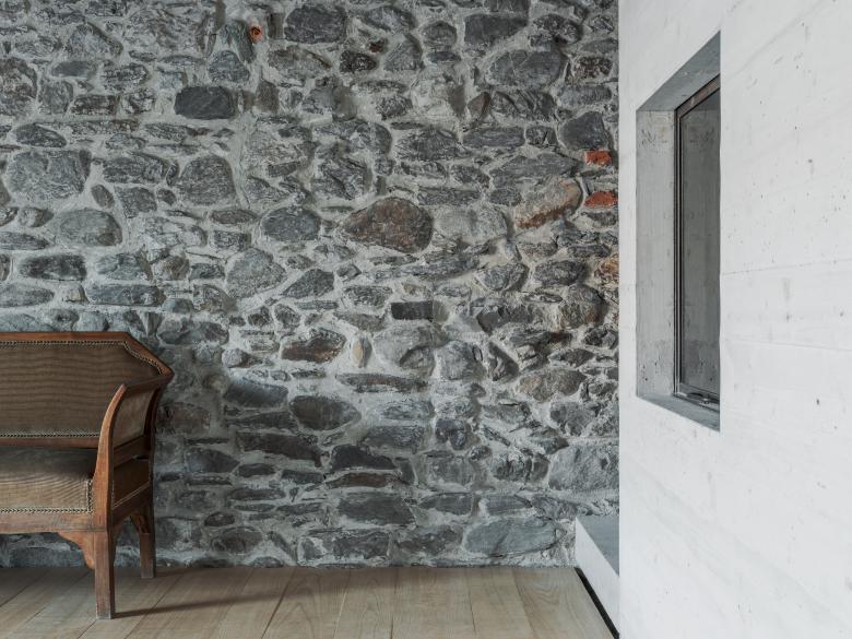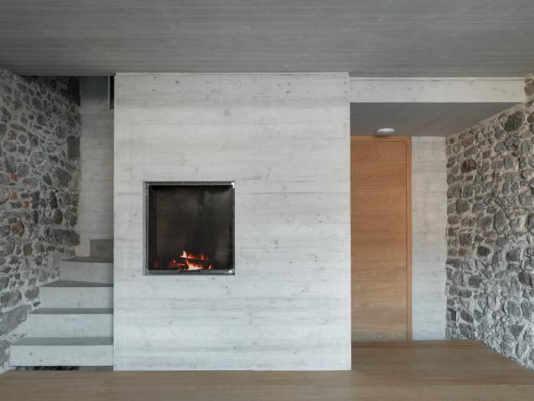 Die Steinwände im Inneren sind in Rasapietra gemauert, der neue Treppen-Kamin-Block besteht aus selbstverdichtendem Beton, mit weißem Zement. Die Elemente aus Holz (Decke und Fußboden des Wohnzimmers, Einrichtung, Türen) sind aus Kastanienholz, ein Material, das schon im vorherigen Gebäudes Verwendung fand. Die Fenster und Türen wurden aus Stahl gestaltet. Die Böden und Wände der Badezimmer sind aus wasserdichtem Mörtel.