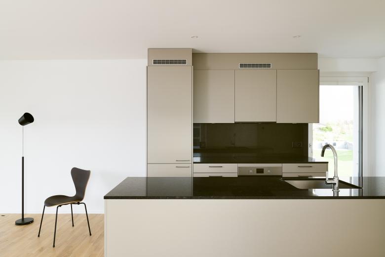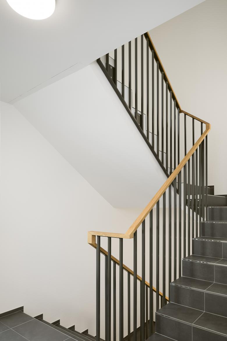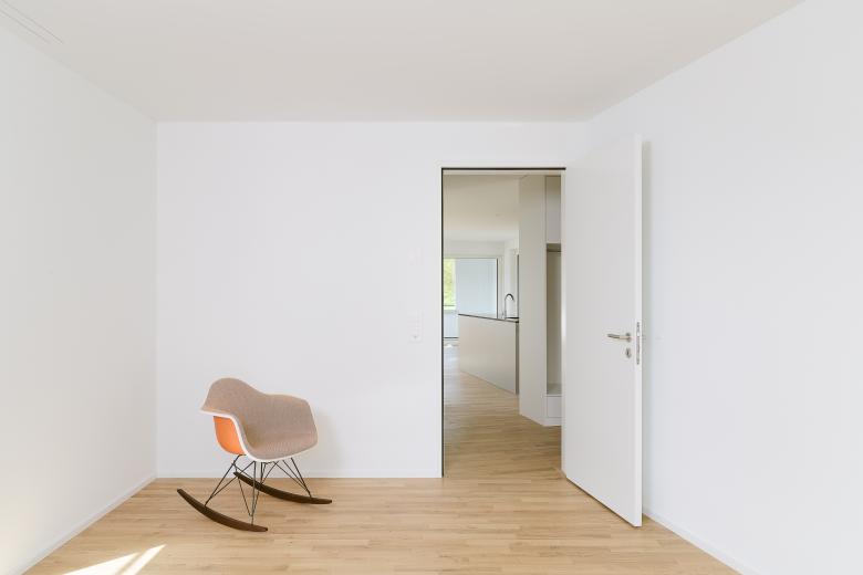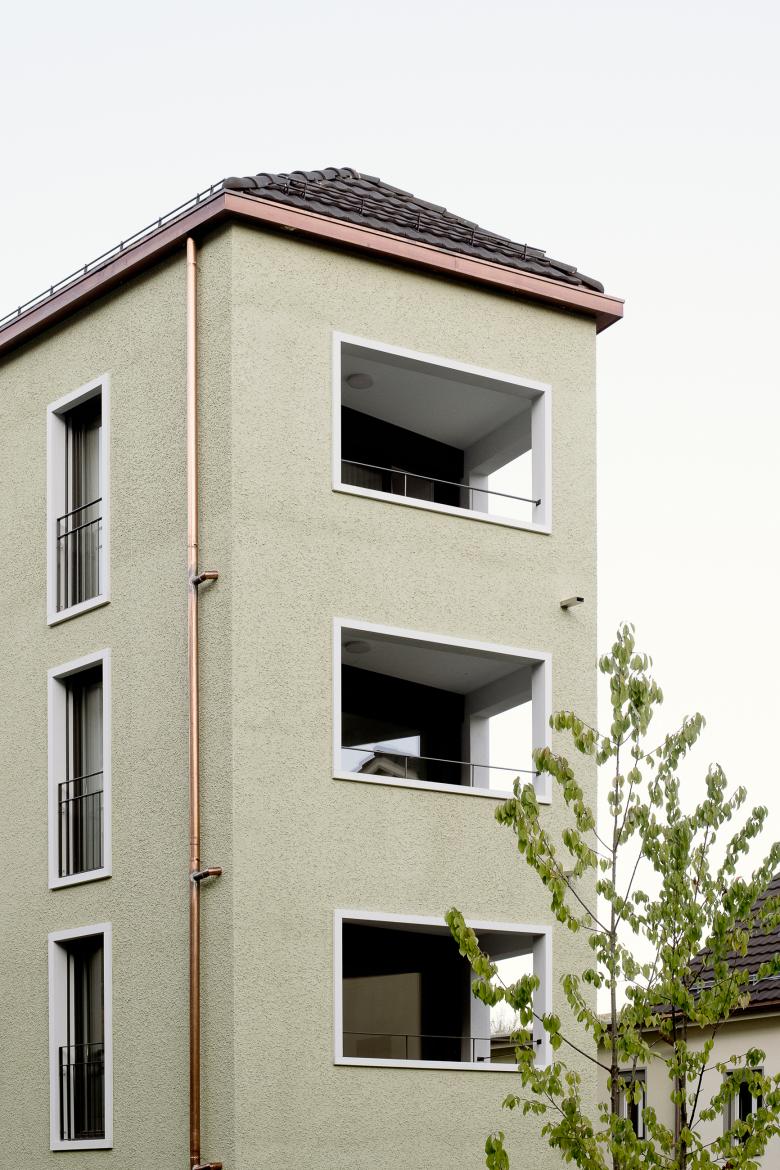 Der Ersatzneubau für ein kleines, baufälliges Haus nutzt die steile Hanglage auf dem extrem schmalen Grundstück für ein massgeschneidertes Turmhaus mit attraktiven 2.5-Zimmer-Wohnungen. Jede Wohnung hat einen kleinen, geschützten Aussenraum nach Westen und besticht durch die raffinierte Raumfolge. Die prismatische Form des Baukörpers ist auch in den Wohnungen erlebbar und ergeben trotz der relativ kleinen Grundfläche eine zusätzliche räumliche Dimension.