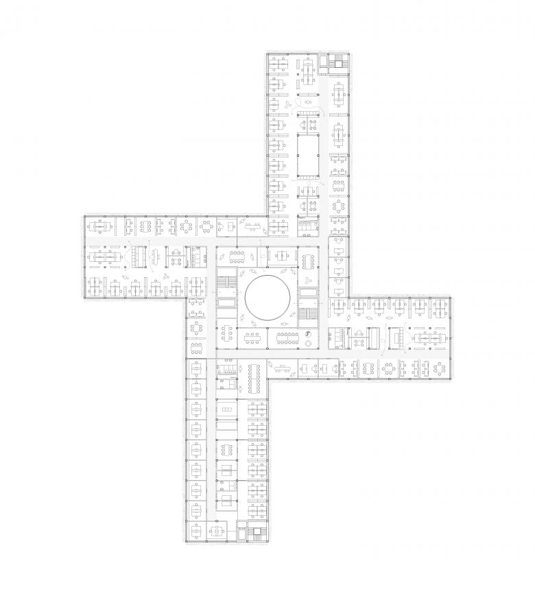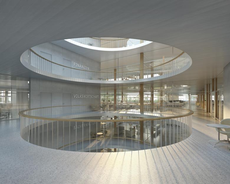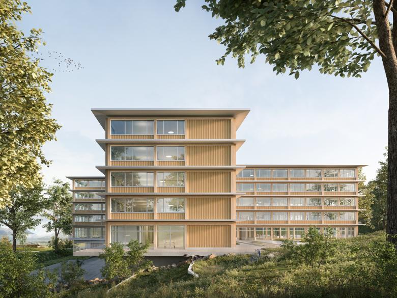 Der Neubau des Verwaltungs- und Sicherheitszentrums Kaltbach soll zusammen mit der bestehenden Anstalt und dem kantonalen Verkehrsamt ein stimmiges Ensemble bilden. Die kreuzförmige, in die Landschaft ausstrahlende Gebäudefigur formuliert vier gefasste Aussenbereiche. Es sind dies im Nordosten der Eingangsbereich für die Verwaltung und die Besucher, im Südosten der Eingangsbereich der Polizei, im Südwesten der Vorplatz der Feuerwehr sowie im Nordwesten der Vorplatz für die Ambulanz. Die einzelnen Gebäudeflügel des Neubaus übernehmen die Gebäudeabmessungen der bestehenden Bauten. So entsteht trotz des grösseren Bauvolumens des VSZK ein stimmiger und spannungsvoller Dialog zwischen alt und neu.