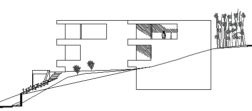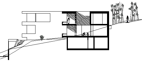 Die Wohnungen des Mehrfamilienhauses sind bestimmt durch den zentralen, zweigeschossigen Hof im Wohnteil. Dieser bringt Licht in die Tiefe der im Erdreich eingebetteten Räume und gliedert die Bereiche Wohnen, Essen, Kochen.