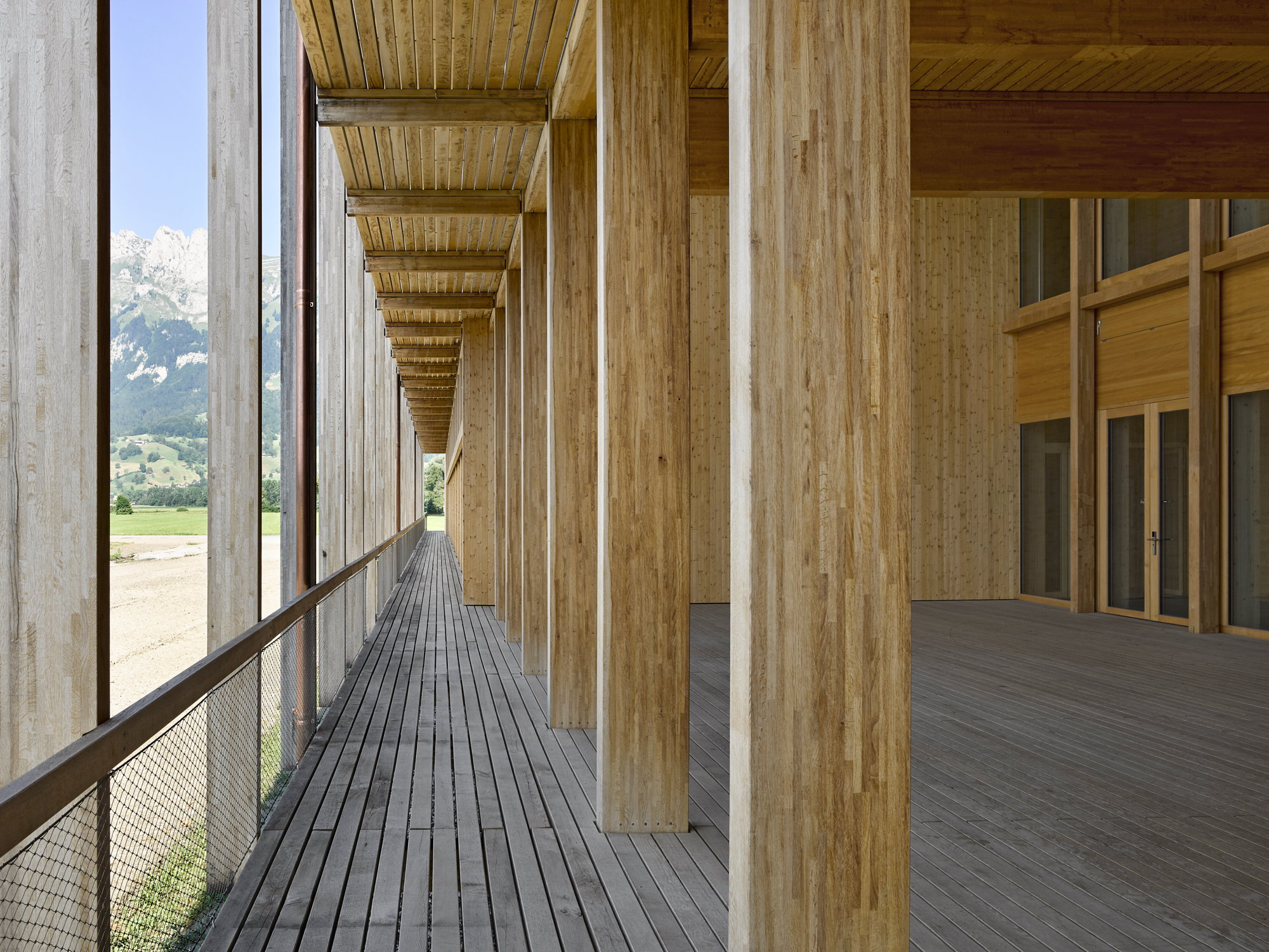 Andy Senns Landwirtschaftliches Zentrum in Salez ist ein Ostschweizer Pionierprojekt: Der große Holzbau besitzt weder eine mechanische Lüftung noch eine Klimaanlage. Für ein angenehmes Raumklima sorgen architektonische Elemente wie Balkone, Schiebeläden und Lüftungskanäle. (Foto: © Seraina Wirz)